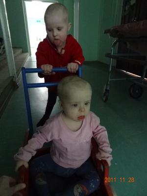 Eigentlich ein schönes Bild, weil Serjosha das erste Mal den Wagen so ziemlich alleine geschoben hat (wir üben grade laufen). Danja dient als Gewicht, damit der Wagen ein bisschen langsamer fährt und nicht kippt.